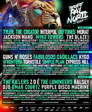 Entre los headliners destacan Guns N’ Roses, The Killers, Zoé y Tyler, The Creator, quienes encabezan una alineación que combina distintos géneros y generaciones. Además, artistas como Jackson Wang, Halsey, Cypress Hill y Grupo Frontera, complementan una mezcla de Headliners para todos los gustos y edades.