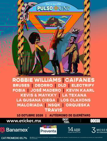 El Pulso GNP 2026 finalmente reveló su lineup oficial y confirmó lo que muchos ya veníamos comentando desde aquel teaser lanzado hace unas semanas: Robbie Williams y Caifanes encabezarán una edición que llega cargada de sorpresas y nombres importantes dentro de la escena nacional. El festival queretano vuelve a posicionarse como uno de los eventos más importantes del Bajío al reunir artistas para todos los gustos y generaciones. Junto a los headliners también destacan nombres como José Madero, Kevin Kaarl, NSQK y Fobia, y la nueva sensación queretana Electrify, entre otros artistas que completan una alineación que es digna de un festival como este.